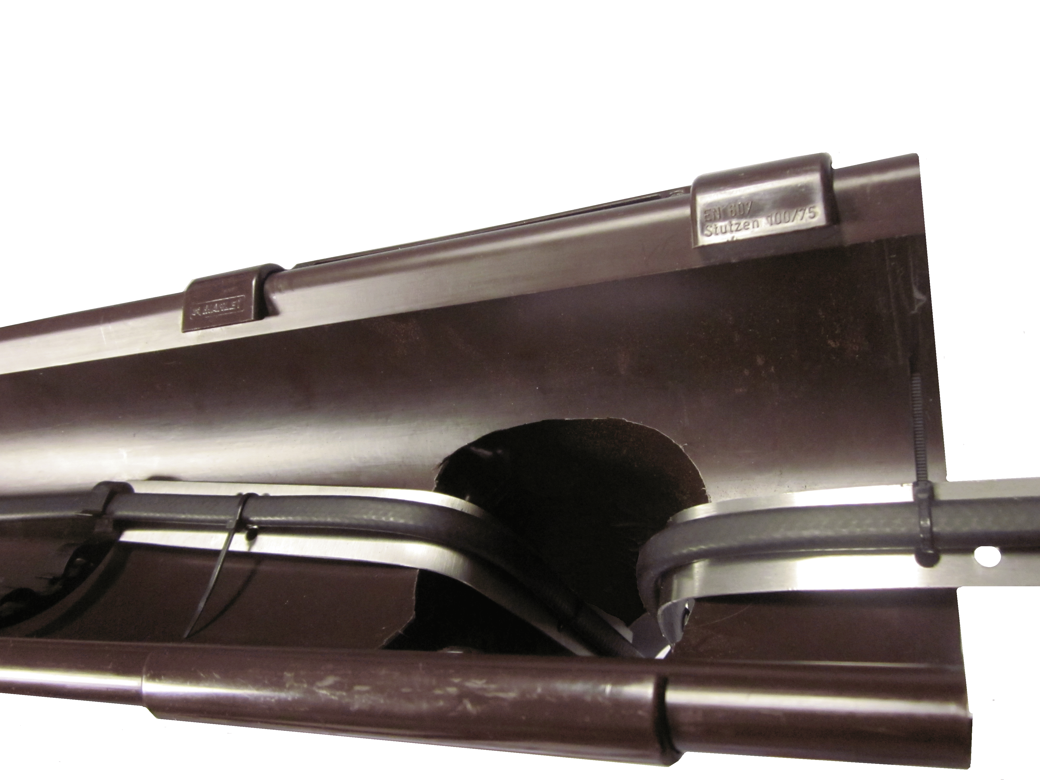 Płaskownik PRR zabezpiecza izolację przewodu grzejnego przed uszkodzeniem na zejściu pomiędzy rynną a rurą spustową.